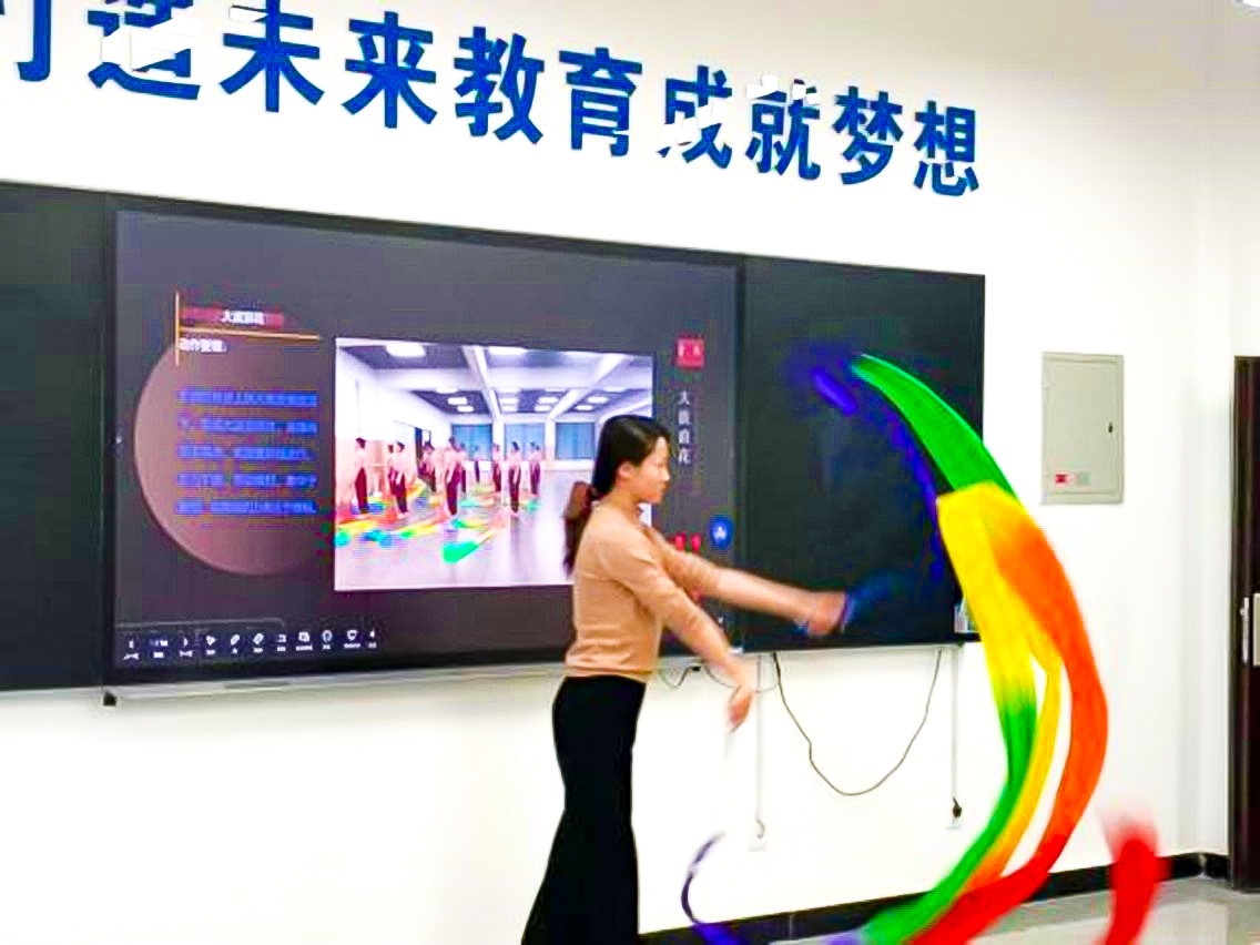 程姝玮老师团队以《敦煌舞》课程为例,通过琵琶与长绸组合舞句的专业训练,生动展示了敦煌舞蹈教学的创新实践;石金蕊老师团队围绕《幼儿歌曲弹唱》课程,注重弹唱技能的阶梯式培养,同时强化幼儿情感共鸣的沉浸式引导,凸显了艺术教育的独特魅力。教育系李娟老师团队以《数字化教育技术与应用》课程为例,结合学前教育专业需求,呈现了AI赋能图像处理与数字化技能的实战价值。设计系张沐可老师团队则围绕《幼儿园教师艺术技能(手工)》,以纸造型专题为例,系统展示了手工技艺在幼儿教育中的多元化应用场景。