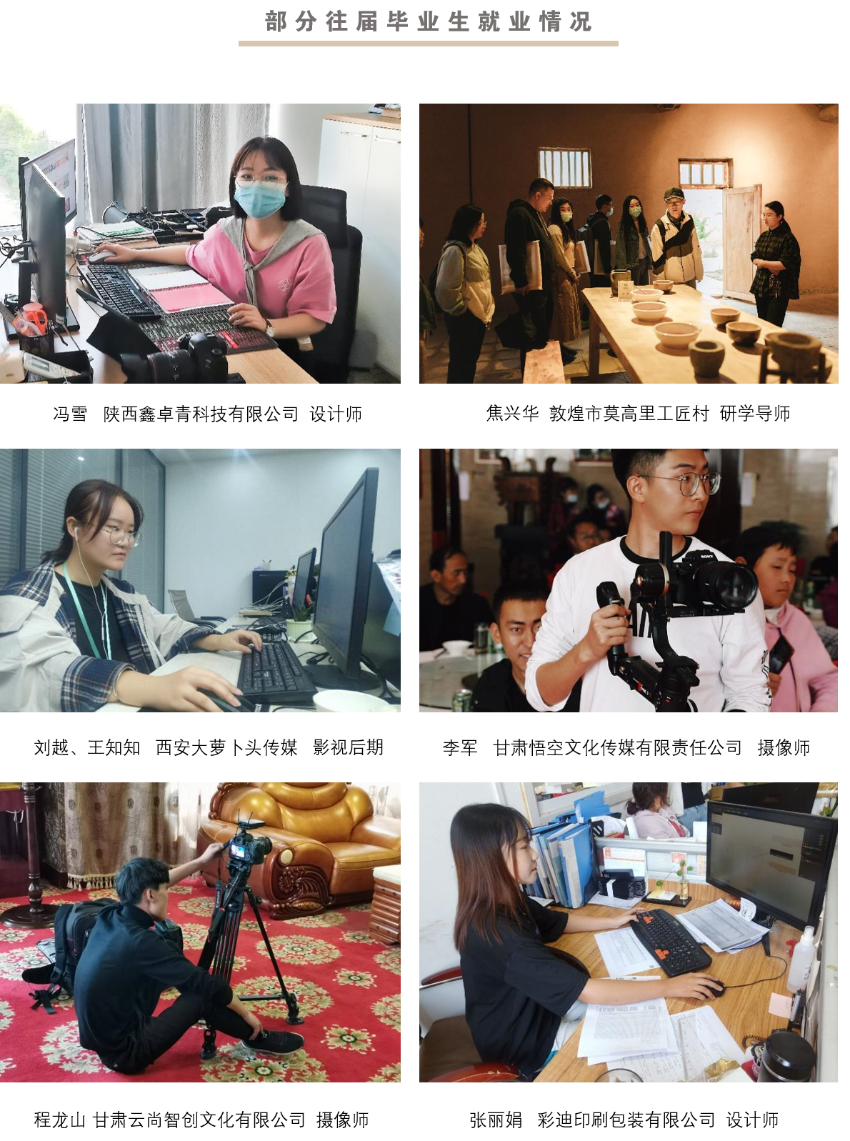 毕业生可在设计事务所类型的设计机构、新媒体艺术设计机构、文化创意产品设计制作机构等各类现代传媒企业或相关政府机构、事业单位从事平面设计、创意策划、摄影摄像、影视后期制作、图文美工、美术编辑、工艺品设计、画师、文化宣传等岗位工作,3-5年逐步升岗职业设计师、设计总监、创意总监、项目经理等岗位,或者学历提升转岗艺术教育、跨专业方向设计岗位(服装设计、工业设计、动漫设计、环境艺术设计等),也可自主创业。